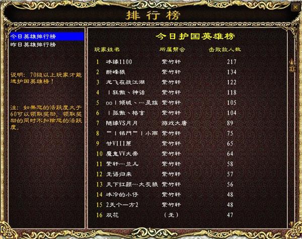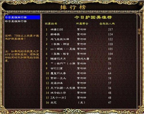 今日护国英雄排行榜 该排行榜记录了今日0:00-24:00这段时间内,本国国民在本国内击败入侵敌人的前20名名单和击杀次数,按照击败敌人的次数多少进行排名,过了24点后将按排名发奖励。等级达到70级以上(包括70级)的玩家才能被国家英雄排行榜记录,70以下的玩家不可以参与。 今日护国榜