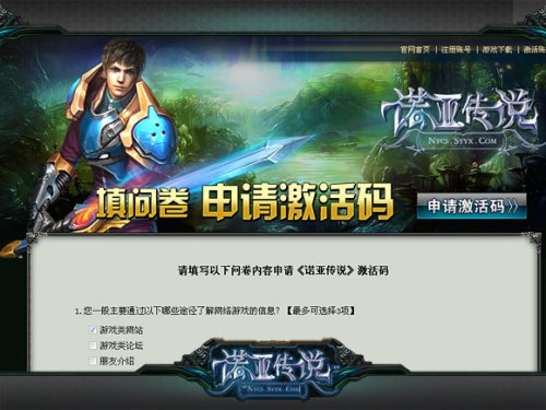 专题页面 【活动地址】http://nycs.syyx.com/dc/ 【参与方式】 登录《诺亚传说》调查问卷专题,完整填写问卷并提交成功,则有机会抽取限量内测激活码。 【活动时间】9月8日起 【活动规则】 1、每个账号只能参加一次活动,每个IP只有一个账号能够参加活动,请勿重复提交申请; 2、您填写的信息对我们很重要,请根据您自身的情况如实填写; 3、完成问卷后就会机会获得激活码,请获奖玩家请及时激活账号。 4、8月25日24:00之前激活的账号不能参与此活动,可以前往老玩家集结令页面查询限量内测资格。