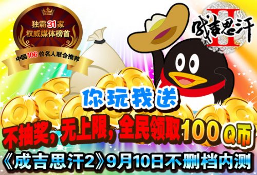 《成吉思汗2》内测全民领100Q币“不抽奖,无上限” 9月10日,《成吉思汗2》“全民领Q币活动”与内测同期开启,玩家注册帐号登录内测服务器,背包中自动获得“百元Q币兑换卡”的奖励标志,凡是用户达到60级后(约需4天时间),点击“百元Q币兑换卡”的奖励标志,即可兑换100元Q币,每人100%获得。