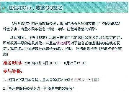 此后,又有很多厂商跟风推出了QQ签名收购活动,一夜之间洛阳纸贵,QQ签名成了炙手可热的厂商推广游戏必争之地。对于玩家的要求也变的五花八门,有要求每天必须在线2小时的,有必须加官方QQ好友的,还有必须连续五天上线的。 暇月战歌收购QQ签名
