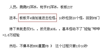 今天,国内某知名游戏门户刊登一篇《国服再出BUG 乌特加德城堡1小时最高120W经验》的文章,而这篇文章并非单纯的事件报道,详细描述了BUG产生的方法。这让人不禁发问:这是事件曝光,还是宣传BUG?而更加过分的是想要完成此BUG必须开“4倍加速”外挂,原来已不是单纯地利用游戏漏洞了,外挂也出马了。随后此文章已被多家网站转载,其中不乏游戏业内知名大站,原来宣传BUG可以带来大量的浏览量。 文中除了介绍BUG方法还有“四倍加速”