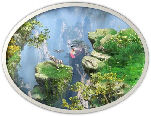 望天涯上小桃红 这次的T台换到了群山之中,模特也不走猫步,而是采用《征途2》中最流行的轻功,从一个崖顶跳至另一个断崖之上,桃红色的衣裙随风起舞,在远处云雾、青山的衬托下,格外娇艳。这个T台的搭建颇费了一番功夫,利用叠层技术让远景和近景融合在一起,才能起到如此唯美的效果。 小桃红