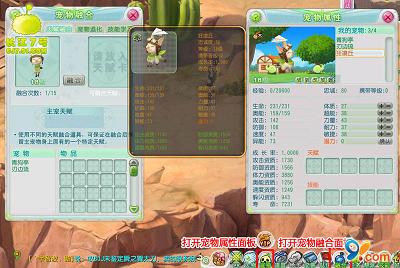 融合四步走,宠物变神兽! 运用宠物融合系统前,让我们先了解宠物伙伴!轻点游戏界面下方功能栏的“宠物”按钮,打开宠物属性面板,可查看宠物当前状态、属性、天赋、技能等信息,还能为宠物喂食、增加属性值,设置战斗等。称职的主人可要经常关注宠物动态哦! 点击功能栏中的“融合”按钮,或按快捷键“Alt+P”打开宠物融合面板,就能打造你的“宠物明星”了!宠物融合系统分为四种:资质融合、天赋融合、宠物退化、技能学习。 宠物属性