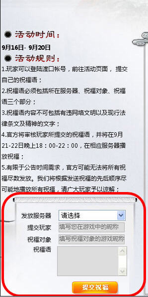 中秋佳节即将来到,你是不是也想邀上三五好友一同庆祝呢?《天之痕OL》将为你打造最独特的中秋节,为大家带来最精彩纷呈的活动。凡是参加《天之痕OL》中秋节活动的玩家,不仅能为自己的好友送出美好的祝福,并有机会得到丰富的奖励。 寄语传情意 云中谁寄锦书来,燕字回时,月满西楼。眼看中秋佳节将至,相信您一定满心祝福想要送给自己的知交好友吧!那么赶快写上你的祝福和寄语,让《天之痕OL》游戏公告为你一诉衷肠! 9月16日至9月20日,玩家可登陆活动页面,留下自己的区号、送祝福对象、以及祝福语,就能在中秋节当晚以GM公告的形式在线送出。“祝福语”必须包括所在服务器、祝福对象、祝福语三个部分,官方将审核玩家所提交的祝福语,并将在9月22日晚上18:00-22:00,在相应服务器播放祝福。