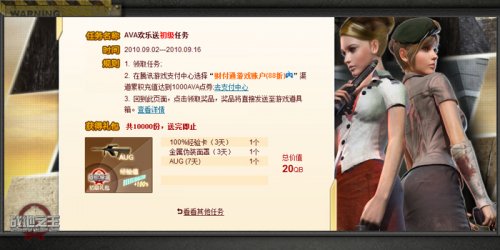 任务二:AVA欢乐送高级任务 您只需要使用游戏账户在AVA中累积充值达到3000点券,即可完成任务。 AVA欢乐送高级礼包:欢乐礼包野战锹(30天)1个、火狐(30天)1个、金属伪装面具面罩(30天)1个 总价值70QB