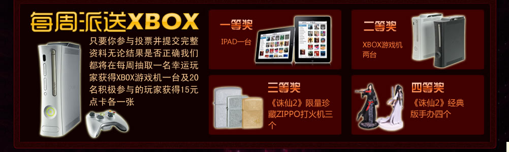 冠军大竞猜投票活动规则 中国区总冠军竞猜规则: 在目前的八大区冠军队中选择您最看好的冠军队伍进行投票支持,如支持的队伍获得最终的中国区总冠军,所有支持此队并提交完整资料的玩家都可获得系统抽奖资格,各种大奖等您来拿! 国际总冠军竞猜规则: 在九个国家及地区代表队中选择您最看好的代表队进行投票支持,如支持的代表队获得最终的世界总冠军,所有支持此队并提交完整资料的玩家都可获得系统抽奖资格,各种大奖等您来拿! 活动时间:2010年9月8日-2010年9月19日 奖品: