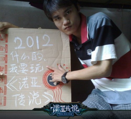 2012哥——2012什么的,我要玩! “2012什么的,我要玩!”这表情,这纸板,这手势,太销魂了。喜欢《诺亚传说》2012的背景题材,2012哥这个名字当之无愧! 2012哥——销魂的不仅仅是手势