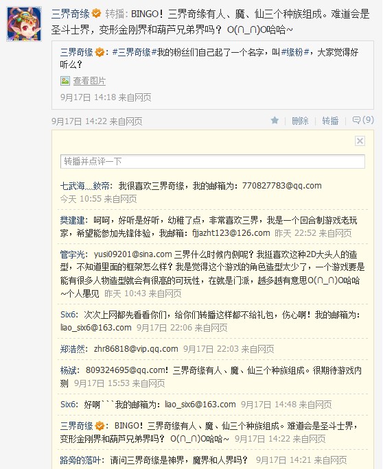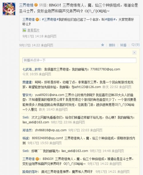 三界奇缘体验号玩家疯抢 为了满足玩家们的需求,《三界奇缘》运营团队已经开辟多种领号方式。最新举办的微博、开心网活动,玩家只需关注并转帖就有机会获得体验帐号;此外,官方开放的公会入驻QQ已经都处于爆满状态,每天都有上千个公会入驻申请领号。 |