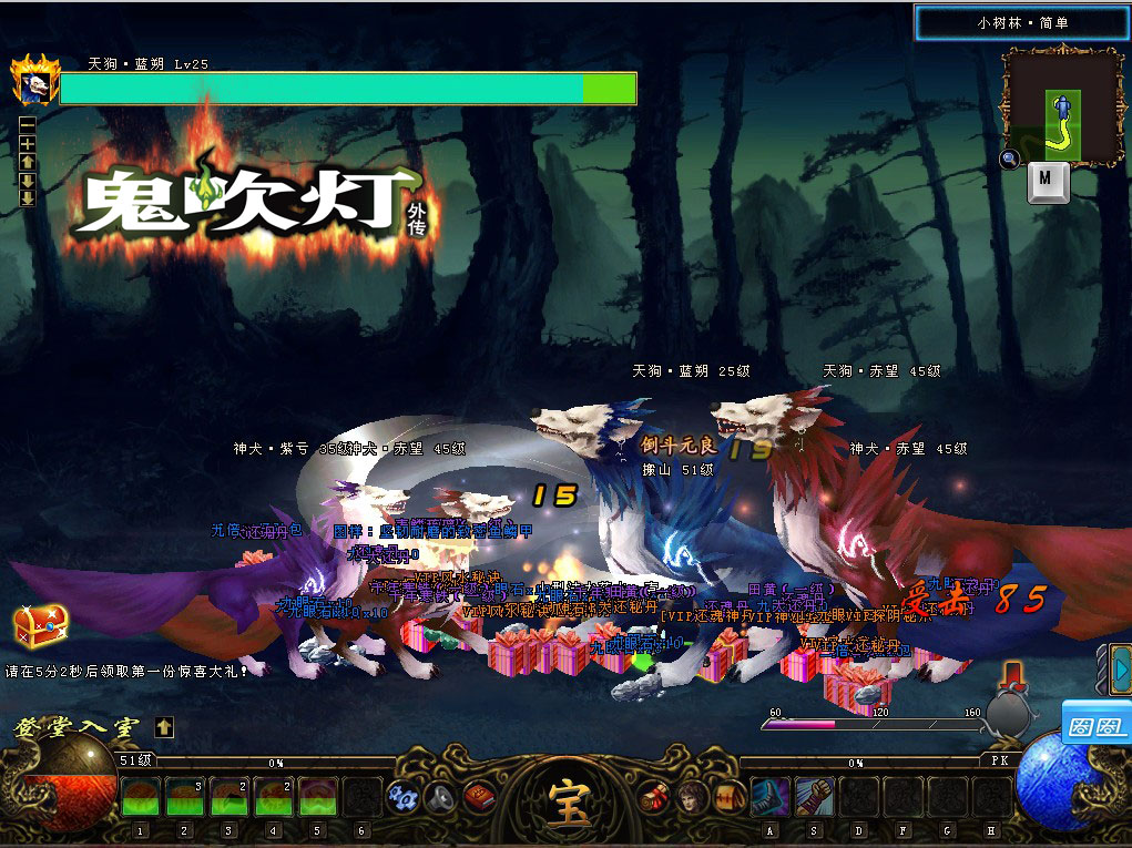 天狗下凡,杂技表演 在众人的心目中,天狗只有一只,哮天犬。但是,这是一个误导。在天庭,嫦娥姐姐除了月兔宝宝外,还有不少天狗宝宝来排遣月宫的寂寞。 此次中秋,天狗们为了让嫦娥姐姐开心一回,特地下凡,在寻常人间表演杂技,让天上的嫦娥姐姐看一出出好戏。如果倒斗们想目睹嫦娥姐姐的天狗的真面目,就需要用月饼来诱惑。 在各大副本,用月饼召唤天狗们,天狗?蓝朔、神犬?紫亏、天狗?紫亏、神犬?赤望四大天狗将会掉落海量经验、经验书、九眼石、海量游戏币、打孔石、古铜银票、装备武器锻造材料、高阶防具、武器图纸等、月神套装图纸等等。