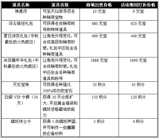 活动三:商城限时道具打折乐翻天 活动时间: 9月20日15:00—9月25日18:00 活动范围:全服 活动内容: 活动期间,商城的部分热销道具将打折出售,原来消费一定元宝只能买X件商城道具,现在可以用同样的钱购买X+N件限时打折道具,机会难得!活动结束后,打折道具价格将恢复到正常价格。 打折价格 快快加入《飘渺仙剑》,更多缤纷精彩,一起欢度中秋假期! 新服限时礼包大抢购 [编辑:糖糖] |