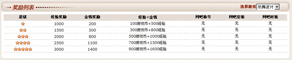 《热舞派对Ⅱ》 “动感音符”火爆公测ing 除了网吧业主能获得游戏点卡奖励外,网吧内的玩家也能得到相应的奖励!凡是在参与到网吧互动平台中的网吧内进行游戏的玩家,都可以获得相应的奖励!包括经验奖励和金钱奖励!奖励的具体数值根据网吧的等级不同而不同。下图是玩家可获得奖励的详细数值: 图中星级指网吧在互动平台内的级别