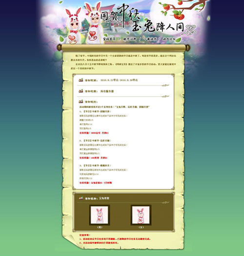 中秋佳节,家家户户团圆的日子。每逢佳节倍思亲,弯弯的小巷、秋冷了月光,思念很漫长,在风中酝酿。今年的中秋月圆夜,你又在思念谁呢? 特别的节日给你带来节日的感动,中秋节即将到来之际,超时尚3D网球休闲网游——《网球宝贝》推出了丰富多彩的节日活动。让广大玩家在中秋佳节这一特别的时刻,记录下每一个难忘的瞬间,一起享受赏月时的美妙感受! 本次中秋活动将于2010年9月21日零点在全部服务器正式开启,持续至2010年9月30日零点结束。活动期间,游戏将开启3个系列任务——“玉兔天降”、“花好月圆”、“团圆月饼”——