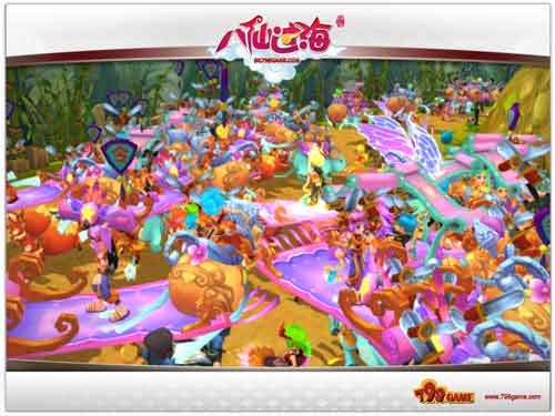 极致画面享受 《八仙过海》是798Game耗资近7000万打造的非梦幻神话回合网游巨作,在继承了一、二代网游精华的基础上,突破了画面与操作的瓶颈,利用“光谱炫彩技术”、“矩阵粒子特效”等一系列世界尖端的画面处理技术,将游戏画面、技能特效进行高强度渲染,让玩家可以在战斗中体验以往回合网游永远无法体验到那种酷炫画面及劲爆动作特效。 欢乐的玩家