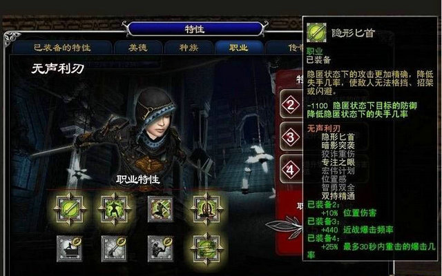 游戏中,刺客在游戏中的DPS(伤害输出)并不是很高,技能多数以DEBUFF为主,纯伤害攻击技能很少,他们穿中甲、不能使用盾牌,不能用弓箭,可双持武器,是除贤者和诗人外操作最难也最讲究的职业。另外,刺客还能够潜行,控怪能力仅次于贤者,而且是团队技主要的触发者,拥有多个触发技能。在副本BOSS战中,刺客的打断技能也非常重要。