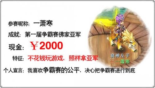 《梦想世界》第二届全国争霸赛火热报名中!本届争霸赛将诞生14-16个冠军,每人高达5000元现金奖,没玩过游戏照样拿大奖,11月7日截止,赶快来报名吧! 没玩过照样拿大奖?有这个可能吗?当然有可能,如果你看了上届争霸赛的获奖名单,你会发现里面隐藏着不少黑马,而且还是一黑冲天,一直黑到拿大奖。不信的话,给你讲述几段争霸赛的真人真事! 论坛某位玩家:我只玩了两个月 第一届争霸赛结束之后,一位玩家出现在论坛,留下这么一句:争霸赛真简单,我玩了两个月就拿了季军。正是这一句话,让他成为了论坛名人,受到无数梦想玩家的膜拜和围观,大家佩服他的实力之余,更嫉妒他的人品运气,因为大家都知道争霸赛是一场很公平的竞技比赛,新人只要熟悉下也能跟高手们一较高低,运气好的话,还能击败甚至完胜曾在游戏里叱咤风云的高手们。 佛家亚军一萧寒:哥才79级 79级是什么概念?大概也就2个月时间就能练到,而这位玩家同样拿到了2000元的亚军大奖。如此“辉煌”的成就,官方还对他进行了采访,你会发现他的参赛目的很简单,来看看他是怎么说的:“我在游戏里面就常跟人切磋,也算积累了一点点经验。看到争霸赛的消息以后,我的第一反应就是可以跟更多的玩家切磋了。初赛以后,我就喜欢上了这种公平的比赛方式,当时就决心把比赛进行到底。说实话,我并没有信心去拿什么名次,但是闯进决赛还是比较有信心的,毕竟我也有一套自己的方法。” 没错,拿奖就是这么简单,《梦想世界》全国争霸赛正等着你来报名,冠军5000现金在向你招手!