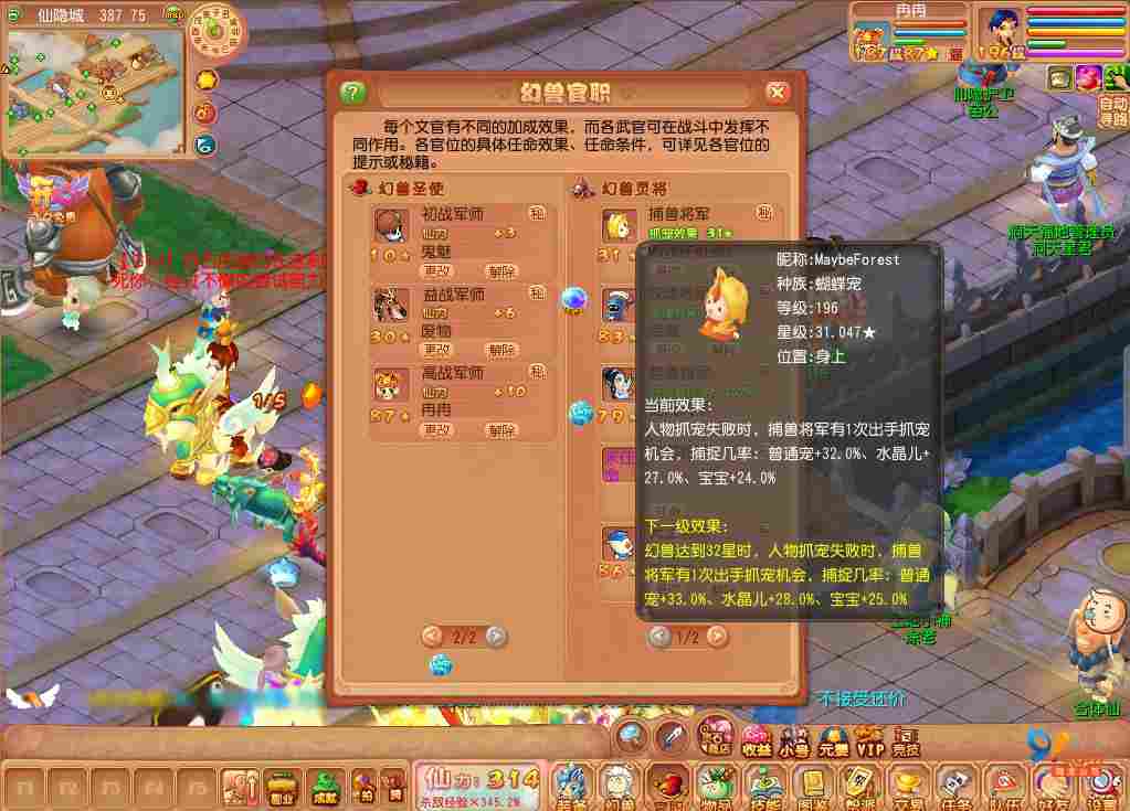蝴蝶宠 化蝶的浪漫 哪只幻兽能够协助你捕捉其他幻兽?10个开心人有9个都会跟你说椰子熊。其实蝴蝶宠也是官职“捕兽将军”中的一员。蝴蝶宠入围2010年最in幻兽不仅仅凭借的是它捕捉的能耐,其“化蝶”技能出神入化,竟然能够携带一只幻兽离场,成为Q版花花世界最“不公平”的幻兽,的确有理由成为关注点!不仅仅如此,蝴蝶宠的长相俏皮,魅力四射,是女性玩家最喜欢的幻兽之一! 我也是捕兽将军