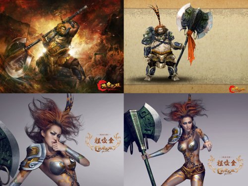 骏马奔腾扬起滚滚黄沙,远处城门萧萧,超现实的脱离感反而有一种神界大战的风范。名将宇文成都俊面含霜,寒色的头缨随风飘动,手中的凤翅镏金镋向上高挥,更显骁勇。 有别于原画浓郁古朴的大唐气息和人体彩绘海报的时尚唯美气息,插画洋溢着超现实主义的玄幻风。在背景画面的映衬下,插画人物形象更加鲜明动人,望之则心中立刻豪情万丈、热血澎湃,恍惚有置身沙场的感觉。