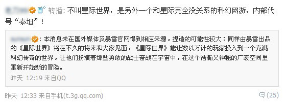 此前曾有消息爆出由暴雪出品的《星际世界》将在不久的将来和大家见面,此消息未在国外媒体及暴雪官网得到相应来源。之后著名的舅舅党在其微博称该游戏名称并非《星际世界》,是另外一个和《星际》完全没关系的科幻网游,内部代号为“泰坦”!据称该款游戏能让数以万计的玩家投入到一个充满科幻传奇的世界,让他们扮演着那些勇敢的战士奋战在宇宙中,在这个浩瀚又神秘的广袤空间里重新开始新的冒险。 |