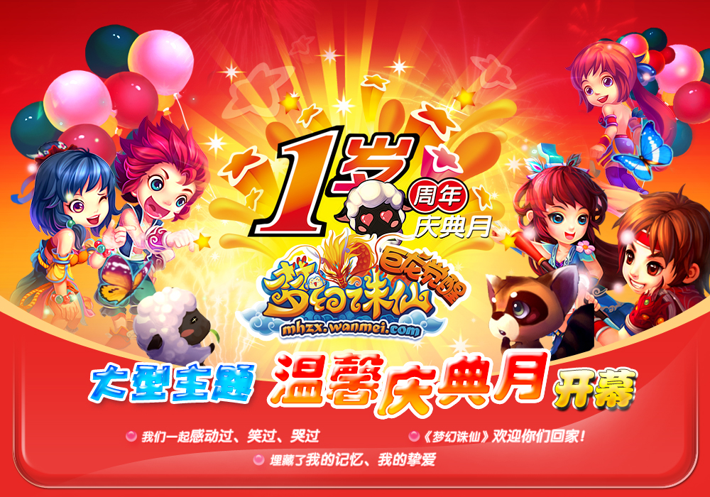 还记得在小竹峰一起看流星雨吗?还记得第一次御剑飞仙的激动心情吗?还记得第一次抓鬼失败时的沮丧失意吗?陈御风、末离、花弄影、栁潇潇……岁月流转,经典永恒,《梦幻诛仙》即将迎来辉煌一周年!从曾经的陌生变为熟悉,从懵懂走向了成熟,365天,我们风雨同路!为了纪念我们一起走过的光辉岁月,《梦幻诛仙》一周年狂欢庆典今日盛世开幕!八大精彩活动、四大全新玩法,顶级龙魂套装、百种丰厚奖品全面上线,惊喜超乎你的想象! 《梦幻诛仙》一周年庆典今日盛世开幕 两组新服开放 诚邀新老玩家入驻 9月29日16:00,随着《梦幻诛仙》一周年庆典盛世开幕,2组全新服务器同时开放!它们分别是: 华北网通五区-【风雷堂】 华东电信五区-【傲龙擎天】 我们一起度过了一年的快乐时光