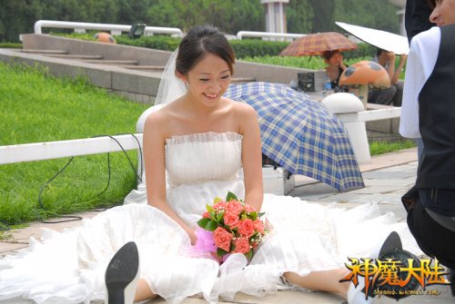 亲爱的在玩“shenmo”? 导演宣布接下来将拍摄一组婚礼的重要镜头,并让演员和剧组成员做好准备。两位海选新人也是本场的男一号和女一号,他们坐在地上做最后的串词。维奇隐约听到他们的几句对白。男生问:亲爱的你在玩儿什么?女生甜甜的回答:玩儿“神魔”呀! 《神魔大陆》实景剧:席地而坐的新娘更可爱
