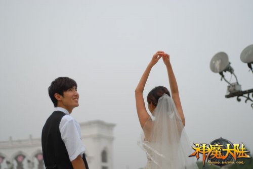 飞出去的是“shenmo”? 洁白的婚纱,灿烂的笑容,优美的婚礼进行曲,拍摄开始了……一对新人牵手走过红毯,在证婚人的祝福下互相告白爱意,新郎新娘的表白尤为特别。新郎:“亲爱的,我愿意将我的点卡、装备、武器以及我的账号密码全给你,你愿意嫁给我吗?”新娘:“我愿意!亲爱的我愿意陪你练级、陪你下副本、陪你挑战世界BOSS,你愿意娶我吗?新郎:“我愿意!” 《神魔大陆》实景剧:我们是神魔爱人
