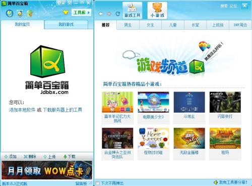 最酷的休闲娱乐必备工具——简单百宝箱 简单百宝箱是一个玩家随身工具箱,收录网游玩家最需要的游戏工具软件,并提供一键式的软件工具下载、管理服务,是一款免费、绿色的网游工具平台软件。 全新的简单百宝箱更新游戏频道,内含大量精品游戏,种类齐全,挑选时下最夯的数十款在线小游戏,根据人群喜好特别为各位玩家设立了下列六大专场,力图为各位玩家打造最优质的休闲娱乐平台。 [编辑:灰色] |