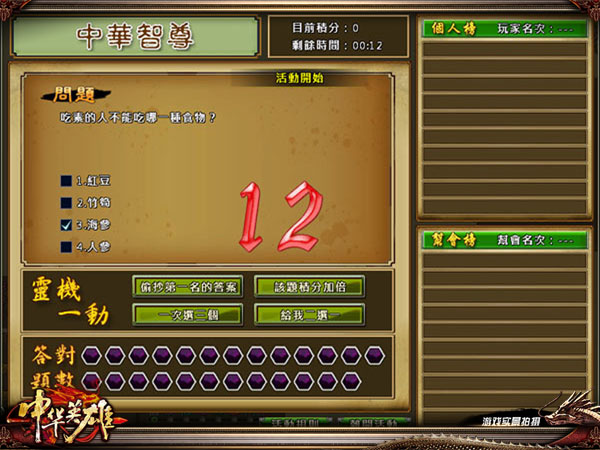在玩家的角色为25级时就可以参加【中华智尊】活动,利用界面右上方活动按钮弹出活动详情界面钮,传送至活动场地。在第一题开始时,请在限制的时间内利用左键点击答案前的框框作答。答对的话,下面的答对题数会亮灯,答错则是打X而且会扣2分,并且在上方显示目前累积的积分。每场活动共有25题。每一题结束时,旁边个人榜及帮会榜的排行会同时刷新。不过你不用担心,当你遇到不会答的问题时,请善用“灵机一动”的四个小帮手帮你拿高分。最后系统按照积分多少给予相应的经验和武点等奖励哦!而中途断线则视作退出活动。 中途离开视为退出活动哦