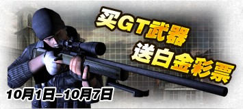 活动三:【买GT武器 送白金彩票】 活动介绍: 活动期间,凡在游戏中购买任意30天GT武器,就可获得白金彩票5张。