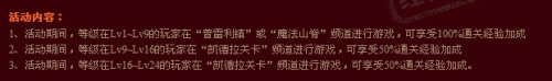 活动七:安全账号奖励,欢畅游戏安全起步! 假期畅玩的同时,大家也要保护好自己的游戏账号!《龙之谷》特别为悉心呵护自己账号的玩家带来“安全账号奖励”活动,10月1日至10月30日期间,绑定密宝或安全卡的账号即可获得5%额外通过经验奖励!为自己的账号做个“安检”,加上多重保护,还能获得经验加成,加速冲级,真是一举多得! 活动八:新手大练兵,成长真快乐! 国庆长假中,《龙之谷》专为蜂拥而至的新人们贴心打造“新手大练兵”活动,送出分量十足的节日迎新福利!活动期间,当新手升到Lv1~24中的指定等级段,并在在活动指定的“魔法山脊”、“普雷利镇”、“凯得拉关卡”频道进行游戏,即可获得高达50%或100%经验加成,让新兵们加速升级,短短7天内轻松跻身高手行列! 2010年国庆黄金周,来《龙之谷》畅玩将是你最成功的选择!8大活动,10分快乐,更能100%收获海量经验、极品道具、珍稀装备等诱惑大礼,让你的长假全面升值,激爽无限! 特权风暴开启 与咕噜噗一起赢龙卡 2010超人气3D革新网游《龙之谷》国庆新服开启 10月中旬第三章 [编辑:tree] |