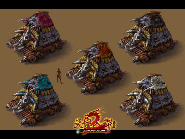 帮会征讨——涿鹿古战场 战车阵容——局势多变 发展到“涿鹿古战场”登场,玩家对游戏的了解逐步加深,对成就、称号和帮会地位的追求与日俱增,涿鹿古战场在万众期待中诞生,成为帮会之间切磋竞技、势力斗争的首选战场。图中的战车因应方位、蚩尤和黄帝等势力设置,分别拥有强力控制技能,拓展了玩家配合的渠道,配合升旗、挖矿的设置,虽然受到帮会等级、发展度的限制,仍不失趣味性。