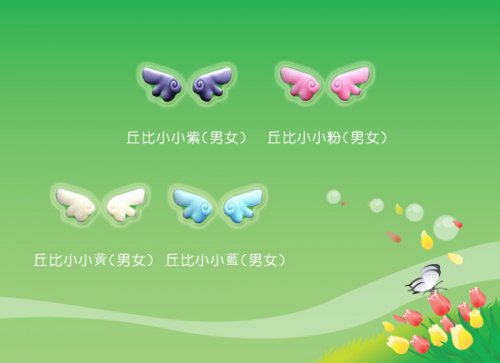 游戏中的其他小饰物,一样是装扮的亮点。时尚个性的服饰,为整体加分、可爱甜蜜的手持,更成为手上独有的风景、而背后的翅膀,更为整体感觉加分。闪耀的翅膀,魅力持续沿袭!快来体验吧! 丘比小小翅膀 卡哇伊色系的小翅膀,外加粉可爱的造型,可是很受小女生玩家的欢迎哦。不占游戏地方,随身携带。小巧玲珑的造型,更为整体的可爱加满分。搭配一套可爱色系的服装,更是无可比拟,还在等什么,喜欢就赶快尝试吧! 展翅之翼 展开的翅膀,如碟翼般在舞台上绽放。搭配任何衣服,都可以恰如其分的展示。唯美的蓝、粉红色比较倾向于女玩家,黑色系则更倾向于男玩家,随心选择!