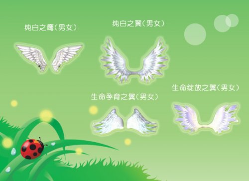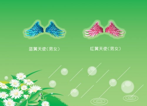 纯白之翼 纯净的白色,透明的色泽,一如那生命最初的美好。没有了舞台上那鲜艳夺目的色彩,有的只是纯洁的白色,感觉的透明。为你带来不一样的视觉感官,值得一试! 红、蓝翼之情侣 完美的情侣翅膀,亮蓝与亮粉的完美色系搭配。舞台上的你们,一定是最闪耀的情侣明星。!和心爱的TA一同带上这天使之翼,游于这游戏之中,甜蜜而美好、温馨而浪漫!