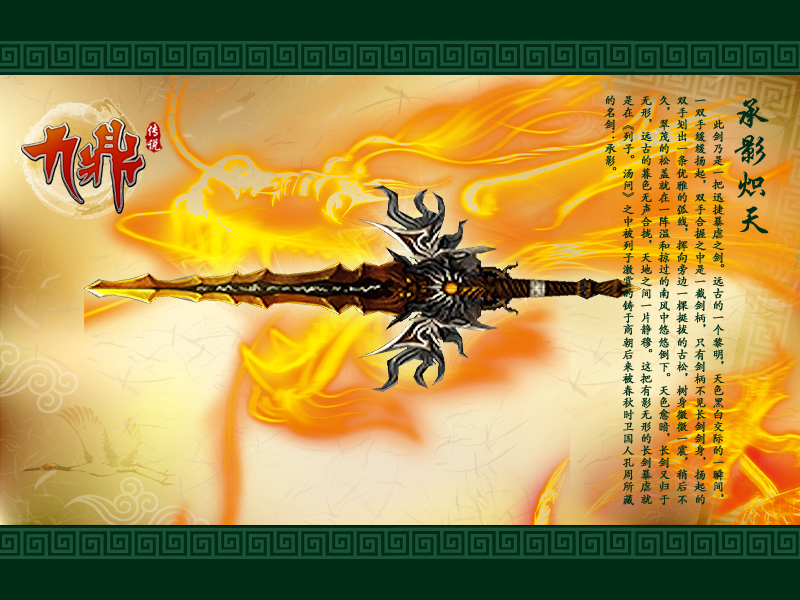 承影炽天——迅捷暴虐,却又归于无形 神器与神兵 九州神兵谱上的八大神器和诸多神兵,是每个九鼎世界里的大侠都梦想拥有的兵刃。神器者,神之气所凝结而成,因此这八件神物分别拥有着各自不同的无上神力,是玩家兵器的终极追求。 神器鲜见于世,仿佛只应天上有,而由此也催生了凡界的神兵利刃,所谓神兵,即指历朝历代,民间能工巧匠所铸的宝剑名刀,由于凝聚了匠人毕生之心血和巧夺天工的技艺,又分别为各族英雄所持而成就了霸业,因而名垂千古。