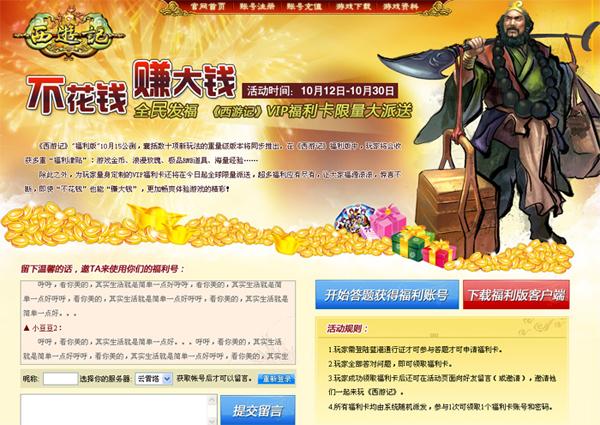 《西游记》福利版将于10月15日启动派金公测,同时推出“元宝摆摊”、“百花仙缘”、“摇钱树”等数十项全新系统,并通过多重活动、任务向玩家派发元宝、金钱、经验、道具等专属福利。为了让玩家尽享游戏乐趣,《西游记》限量版VIP福利卡今起全球派发,超多福利应有尽有,让玩家福源滚滚惊喜不断,即使“不花钱”也能“赚大钱”! 专属VIP福利卡今起派发 全球限量豪礼重重 即日起至10月30日,《西游记》专属VIP福利卡全球派发,玩家登陆专题页面即可免费领取。本次发放的VIP福利卡全球限量,累计仅为88888张,卡内不仅含有价值888元的新手大礼包,同时还有蓝色法宝袖珍悟空、欢乐红包、会员卡等极品道具,幸运玩家更可获赠月会员福利及88888元宝大礼! 玩家成功领取VIP福利卡后,也可通过在活动页面向好友发送留言的方式,邀请好友共同来体验《西游记》网游奇幻乐趣!还在犹豫什么?时间有限,快来抢领吧!