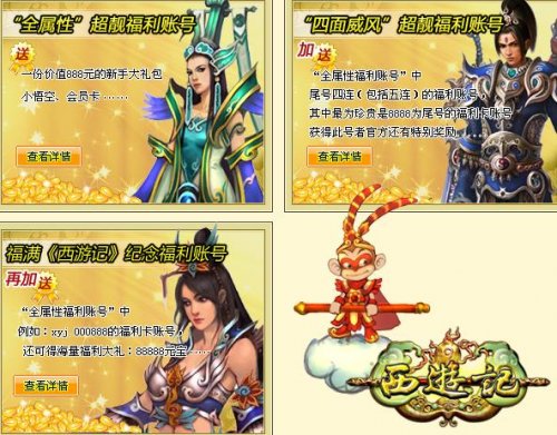 幸运玩家享好礼 三款靓号最高派送88888元宝福利 《西游记》福利卡账号是专门为“福利版”特设的专属账号,本次活动限量发放88888个。该账号共9位,以“xyj.”开头,其余5位数字随机组合,如xyj.00031即为一个福利卡帐号。活动期间,凡领取到“福满西游纪念版福利账号”、“四面威风超靓福利账号”、“全属性超靓福利账号”的幸运玩家,均可额外享受元宝、极品道具等福利,最高奖励为88888元宝!
