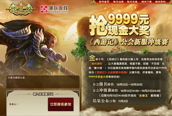公会新服冲级赛 9999现金大奖待你抢 10月12日,蓝港在线携手国内领先语音平台多玩YY共同举办的《西游记》公会冲级赛火爆开启!玩家参与冲级赛活动,将会收获多重福利津贴,更有9999元现金大奖等你来抢! 公会报名时间:10月12日-10月20日 赛事开启时间:10月15日14:00-10月31日24:00 活动区服:仅限10月15日14:10当天开放的新区“金镶玉” 比赛结果公布日期:11月3日