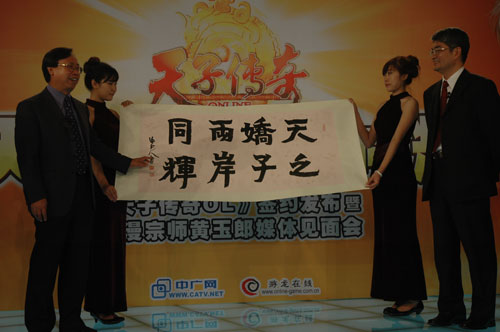 为了见证《天子传奇OL》内地代理权签约的历史意义,中广网总裁王平先生还特地向黄玉郎大师和吕学森先生赠送了中国传统书法作品作为纪念,黄玉郎大师和吕学森先生也分别回赠了礼品。 天子传奇 天之骄子两岸同辉