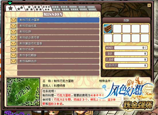 料理师傅NPC 抛弃纷繁复杂的任务要求,在《风色幻想OL》里,主人们只要达到只要达到了一定的等级,就可以去缎带镇北大门区的料理师傅处接料理任务,通过收集指定数量的食材,向料理师傅交付任务,即可制作各种精美的料理。有时候一些其他的NPC也能接一些做料理的任务,这可就要玩家们在游戏中细心寻找喽!