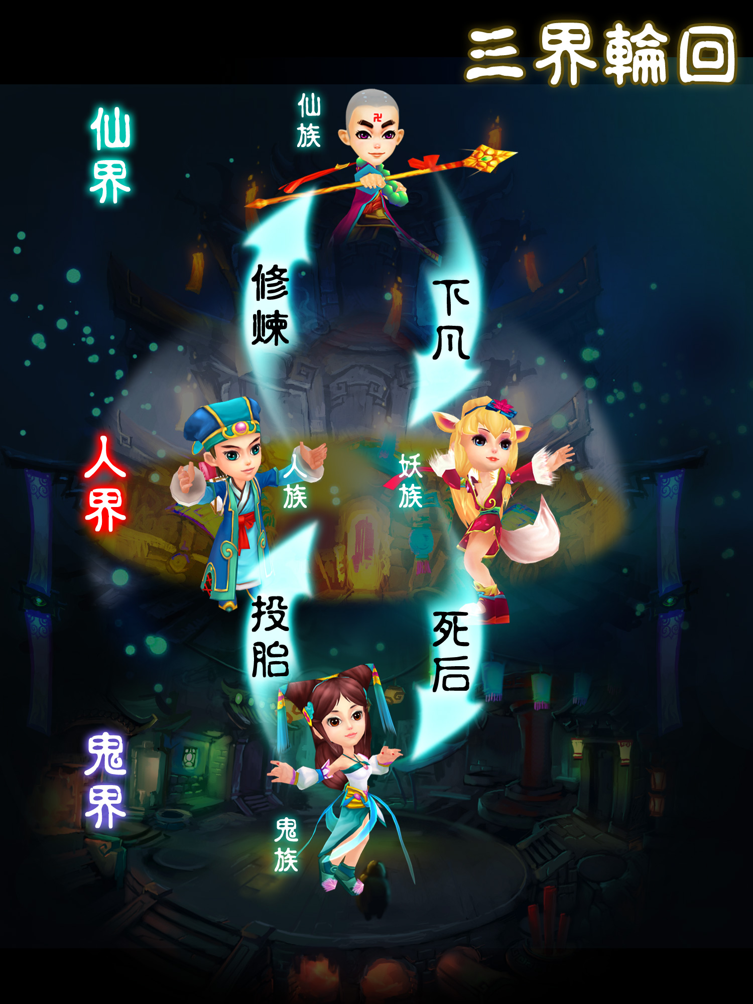 《梦幻聊斋》人鬼妖仙4大种族轮回前世今生 三界五行 任君驰骋 在《梦幻聊斋》三界五行的宽广世界中,玩家可以尽情选择满足自己喜好的人鬼妖仙四大种族多达16种不同角色:冷酷型、可爱型、潇洒型、艳丽型、凶狠型、呆傻型,应有尽有。更可以自由加入到:兰若寺、崂山观、神机营、安期岛、阴阳界五大门派。各个门派都拥有极具特色门派技能、百变法宝、独特坐骑。