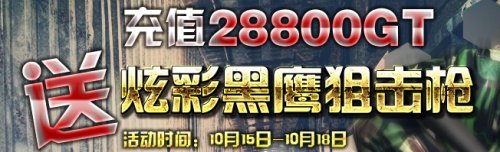 活动时间:10月15日-10月18日 活动地址:http://sf.gtgame.com.cn/promotion/2010/SentBlackHawk/ 活动介绍: 活动期间,单日累计充值28800GT,待活动结束后,将获得最新推出的黑鹰M110狙击枪(永久)和发光道具1个。