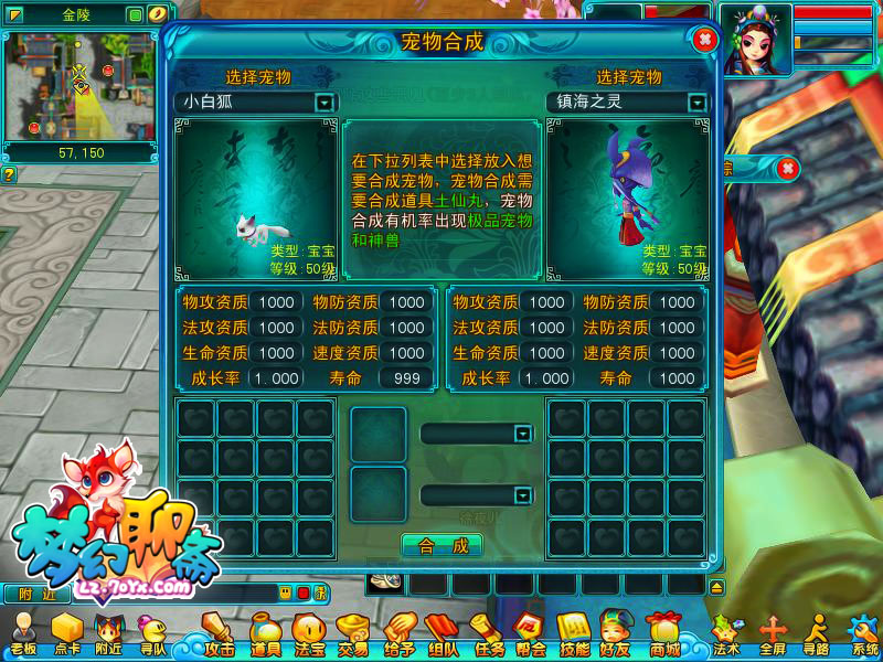 因为我白天相对较忙,直到10月20日,在进入《梦幻聊斋》的第五天,我才到了50级,终于体验到了“宠物炼化”这一终极封测阶段的新玩法:首先是来到金陵城(57.149)找到徐夜儿,选第二项,宠物合成。炼化的2只宠物必须是宝宝,且携带级别高于45级。好在我一直精心培养了6个高级别的宝宝,正好狐狸与镇海之灵各3只,都是一路艰辛地培养而成的高级别携带的宝宝。接下来又会发生什么呢? 《梦幻聊斋》宠物炼化二合一会变怎样?
