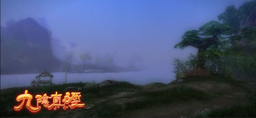 从烟雨庄望向不远处的河边,笼罩着淡淡地朦胧白的雾气,群山在河的身后若有若现的在眼前伫立着。