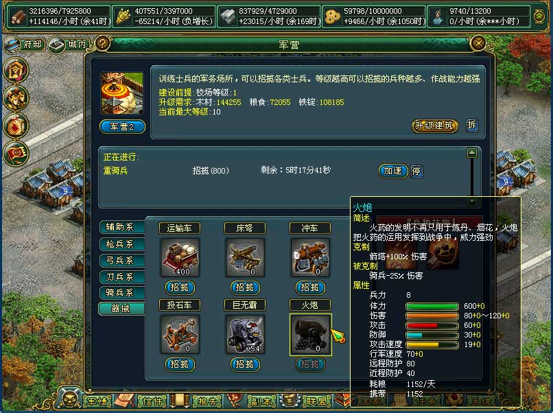 具有两招特技的火炮兵 而且不管是兵对兵还是将对将,都有一套相互克制的策略,一招鲜吃遍天的囧况不会在《梦想帝王》中出现。将、兵、君主技能以及计谋的合理搭配,才是《梦想帝王》的制胜之道。