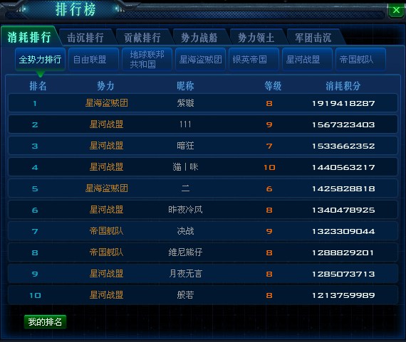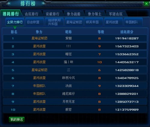 打飞机 抢机票 在《星战》新服“通天帝国”的每个轮回中,积分最高的五名玩家可获得不等值的芒果网积分卡和《星战》代金卷,芒果网积分卡中的积分可以在芒果网兑换相等价值的机票或礼物。《星战》积分排名的规则为:每个轮回消耗积分*5%+每个轮回击沉积分*95%=每个轮回的总积分。 星际迷航排行榜参考