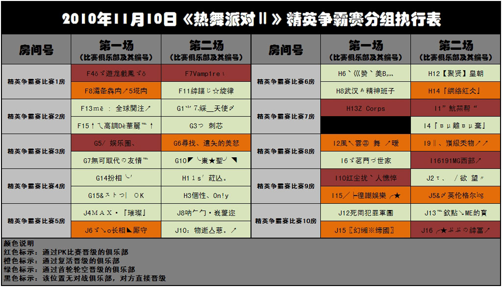 轰轰烈烈的《热舞派对Ⅱ》精英争霸赛已经走过了第一阶段,数十个精英俱乐部已经小试身手脱颖而出了。然而接下来的比赛将更加激烈,形势也将更加严峻。各路热舞英雄们将在这个选手逐步减少的舞台焕发出越来越耀眼的光芒!我们坚信,本次的《热舞派对Ⅱ》精英争霸赛一定能选拔出全服最卓越的舞林王者。 2010年11月9日《热舞派对Ⅱ》精英争霸赛分组执行表 2010年11月10日《热舞派对Ⅱ》精英争霸赛分组执行表 2010年11月11日《热舞派对Ⅱ》精英争霸赛分组执行表 ■活动信息 -11月8日(周一)晚18点将举行俱乐部会议,地点在YY语音频道:30154132,本次会议中,各俱乐部无论是否晋级都要参加。 -现场比赛输了的俱乐部也不用气馁,特设的投票复活机制可以让你在下一轮比赛中重新登上王者舞台,与全服高手同场竞技。获得投票数高的俱乐部可获得一次晋级的权利,在复活名额范围内,票数最高的俱乐部可以被复活;在比赛结束后,赢得投票总数前三名的俱乐部无论胜负,皆同样会有冠亚季军的梦想基金奖励。 -每场三首歌决胜负,依次采取下列模式进行比赛:4K同步组队模式(bpm140-200);四键节拍组队模式(12级以上随机);4K同步组队模式(bpm140-200)。本比赛不记比分,只记胜负。 -本次比赛中,舞技PK前三名和获得票数最多的前三名俱乐部将获得总数10000元的梦想基金。其中冠军队伍将获得5000元梦想基金;亚军队伍将获得3000元梦想基金;季军队伍将获得2000元梦想基金。