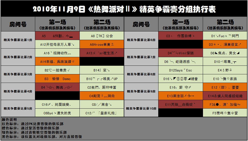 《热舞派对Ⅱ》精英争霸小组复赛即将在今晚战火重燃,32个俱乐部将在今晚打响第一战。激烈的舞场PK将刷新你对精英舞者的定义,热烈的场外欢呼将带你进入全民PK的新时代。拿起你的各种喇叭,为场上华丽的舞者们呐喊吧,告诉他们你是多么地为他们骄傲!敬请关注《热舞派对Ⅱ》精英争霸赛! 2010年11月9日《热舞派对Ⅱ》精英争霸赛分组执行表