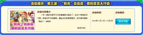 第三波 活动三:三界奇缘系列活动第三波——告别光棍,爱的宣言 活动时间:2010年11月11日——12月2日 奖项设置: 一等奖(一名):价值269的微星(MSI)小魔怪系列泰狼版1.8英寸移动硬盘30GB一个 二等奖(一名):价值100元的雷柏无线鼠标一个 三等奖(一名):精美U盘+T恤 幸运奖(十名):腾讯黄钻贵族一个月 活动规则: 1、参与活动的用户需拥有论坛注册帐号,并在在活动时间内通过宣传途径进入活动页面参与本次活动; 2、所有想要参与活动的玩家,均需要在《三界奇缘》叶子猪活动页面中发表,如在其它地方发表,将视为不参与本次活动。 3、用一段话写出你的恋爱宣言,可以是甜蜜的,也可以是苦涩的,字数至少100,不超过800字。在投稿内留下自己的电子邮箱、游戏ID、人物名称、文章标题、文章简介、资料必须正确有效,以便领取奖品。 4、标题、文字内容必须积极向上,不涉及色情、政治等国家相关法律所不允许的内容; 5、所有文章必须原创,一旦发现抄袭、剽窃,修改他人文章的行为,将取消活动资格; 6、所有投稿的玩家,其作品叶子猪及《三界奇缘》官方可在论坛及网站上进行转载。 7、同一个ID只能有一次获奖机会,获奖名单将在活动结束后,在论坛相关版块中进行公布; 8、以回复时间为参考时间,活动结束前,由玩家票选出一二三等奖,活动结束后,我们的小编会在符合活动规则的玩家中抽取幸运玩家,分别发放相应的奖品,所有符合活动规则的玩家都具有抽奖资格; 9、本活动最终解释权归叶子猪游戏网及《三界奇缘》官方所有。
