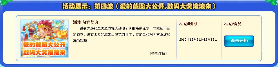 第四波 活动四:《三界奇缘》系列活动第四波——爱的截图大公开 活动时间:2010年12月3日——12月13日 奖项设置: 一等奖(一名):价值300元 超炫MP3一个 二等奖(一名):价值100元 雷柏无线鼠标一个 三等奖(一名):精美U盘一个+T恤 幸运奖(十名):腾讯 黄钻贵族一个月 活动规则: 1、所有想要参与活动的玩家,均需要在《三界奇缘》叶子猪活动页面中发表,如在其它地方发表,将视为不参与本次活动。 2、所有的参赛画面必须以《三界奇缘》游戏内的情侣或夫妻截图为内容,且需要与图片相关的心情描述及图片名称、游戏昵称。 3、图片可以PS、但不得使用他人游戏截图,所有上传作品经过审核出现在作品展示区。 4、参赛图片、标题、文字内容必须积极向上,不涉及色情、政治等国家相关法律所不允许的内容。 5、所有参赛的玩家,其相关参赛作品叶子猪及《三界奇缘》官方可在论坛及网站上进行转载。 6、请确保您对所投图片及相应文字拥有完全版权,如果由此侵犯了任何第三方的权益,由投稿人承担一切责任和损失。 7、不得一稿多投,且必须是原创图片和相应文字,否则,一经发现将撤销内容,情况严重者予以公告。 8、一个账号只能参加一次,且只能上传一张图片。 9、投票者必须为登录的叶子猪会员身份,24小时内每个账号只能投5票。 10、上传图片同时,务必填写详细正确的个人联系方式和资料,以便发放奖品。 11、叶子猪及官方有权对稿件进行编辑和修改、玩家向叶子猪及官方所投之稿件即表明您已同意将该作品的使用权授予叶子猪及《三界奇缘》官方,同时参与本次活动,即视为其已同意并接受上述全部条款。 12、票数排行在前三名的将会获得不同程度的奖励。 13、本次活动最终解释权归叶子猪及《三界奇缘》官方所有。 [编辑:糖糖] |