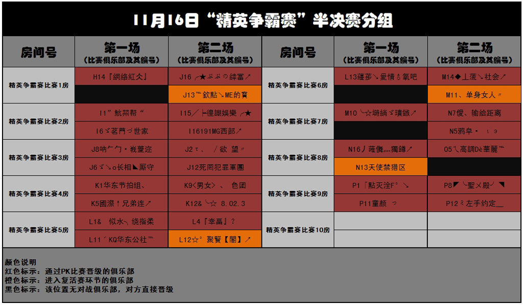11月16日“精英争霸赛”半决赛分组 ■活动信息 -每场三首歌决胜负,依次采取下列模式进行比赛:4K同步组队模式(bpm140-200);四键节拍组队模式(12级以上随机);4K同步组队模式(bpm140-200)。本比赛不记比分,只记胜负。 -现场比赛输了的俱乐部也不用气馁,特设的投票复活机制可以让你在下一轮比赛中重新登上王者舞台,与全服高手同场竞技。获得投票数高的俱乐部可获得一次晋级的权利,在复活名额范围内,票数最高的俱乐部可以被复活。 -本次比赛中,舞技PK前三名和获得票数最多的前三名俱乐部将获得总数10000元的梦想基金。其中冠军队伍将获得5000元梦想基金;亚军队伍将获得3000元梦想基金;季军队伍将获得2000元梦想基金。