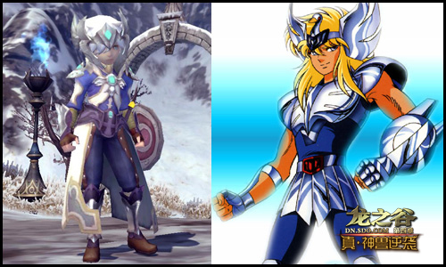 酷似圣斗士!牧师十字军套装 牧师全新的战斗时装——十字军套装绝对是《龙之谷》世界炫酷的代表,从外型来看,简直像煞了圣斗士中冰河的圣衣,十字军套装分为三种,属性与颜色都有明显差异,海洋十字军套装的颜色神似青铜小强的感觉,而寒冰套则与白银圣斗士有点近似,至于光芒套装与黄金圣衣一般耀眼夺目!难道牧师套装的设计者是一位忠实的圣斗士Fans?!